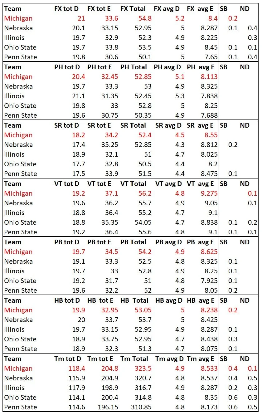 Michigan won its sixth straight Big 10 title (and Fred Richard won his fourth consecutive Big 10 AA) in a meet in which no team had a perfect day by pulling away from Nebraska in the last rotation. Nebraska was just 0.3 points behind Michigan going into rotation 6, where Michigan went to vault to score 56.2, and Nebraska went to HB to score 53.7. Michigan finished the meet with the highest total difficulty. Nebraska’s execution was 0.1 higher than Michigan’s, but Michigan’s difficulty edge gave them the meet. Illinois finished third, competing with a team difficulty only 0.5 tenths behind that of Michigan. Illinois has had some bad luck this season and had some in this meet, with Preston Ngai having to let go of the rings because of a cramp and eventually withdrawing from the All Around.