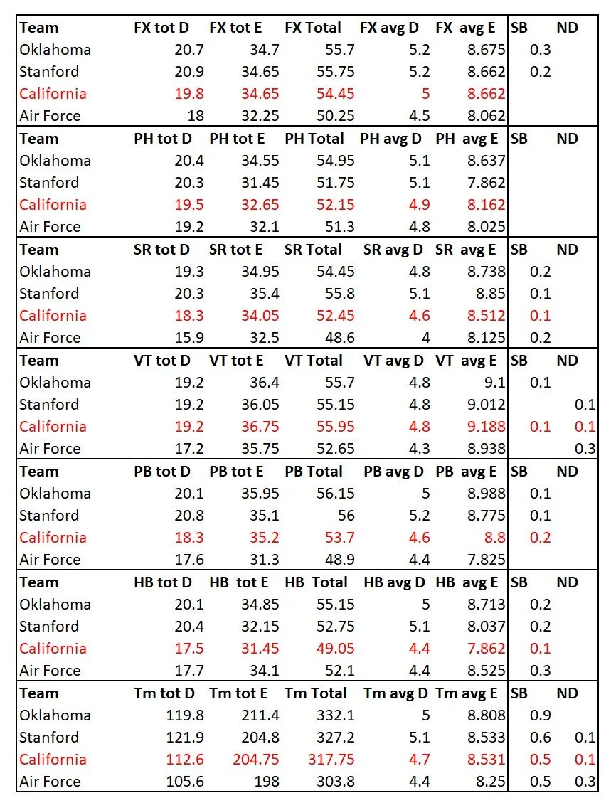 Oklahoma dominated from the second rotation and held steady to the finish, achieving the highest score of the 2026 season (332.1) and defeating Stanford by 4.9 points. Stanford had most of its troubles on PH and HB, although they did achieve their season high score. California recorded its season high (317.75) while competing with its highest team difficulty of the season. Jared Fry of Air Force was the only AA competitor, earning himself a berth as an individual competitor at the NCAA Championships.