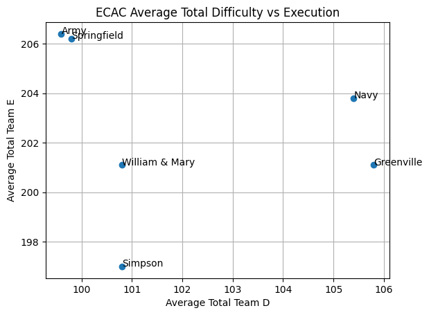 Greenville is coming in with the highest difficulty (but not by much) , Army with the highest average execution, and Navy with the best balance between the two (which is why the computer is favoring Navy. The winner here will be highly dependent on luck. Any one of the top three could do it, and I would not rule Springfield out. The battle between third and fourth could also be exciting. As can be seen from the graphic, Springfield and Army are very close together. Army will have home gym advantage and may have been pulled down in the computer model by one really bad meet early in the season.