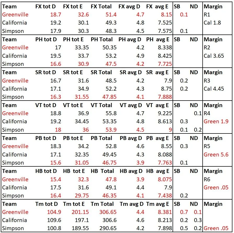 Greenville took down its second D1 team of the season, defeating California and Simpson. California led for the first three rotations, but Greenville turned it around on vault and ended up defeating California by 0.05 points. A bright spot for Simpson was Braxton Jones 14.45 on vault.
