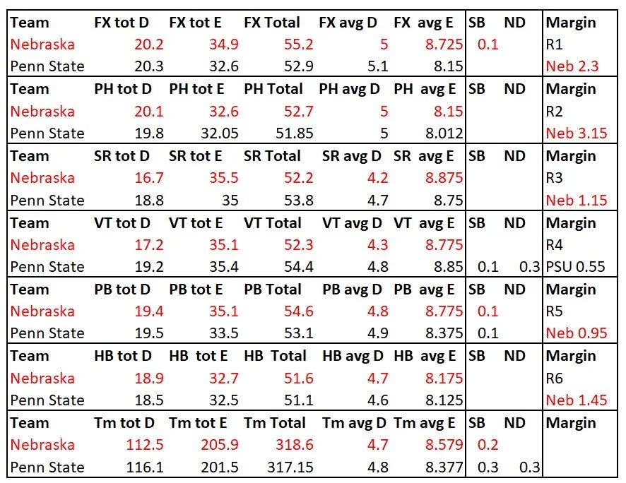 Nebraska and Penn State had a close one, with Nebraska eventually taking the meet by 1.45 points. Nebraska took an early lead with a massive 55.2 on floor (the highest in the nation so far). Penn State turned it around with a strong performance on still rings, but Nebraska answered with a strong performance on parallel bars and held on through high bar to take the win.