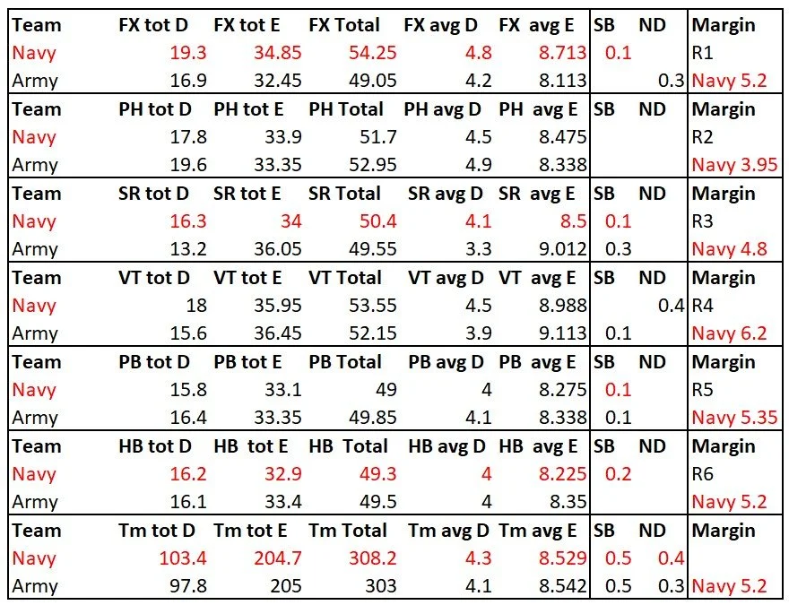 Navy defeated Army 308.2 to 303. Army performed to its potential, outexecuting Navy by 0.3 points, but the 5.6 D score advantage won the day for Navy. Navy started out strong with the seventh-highest floor score in the nation so far this season (54.25) and held that lead until the end.