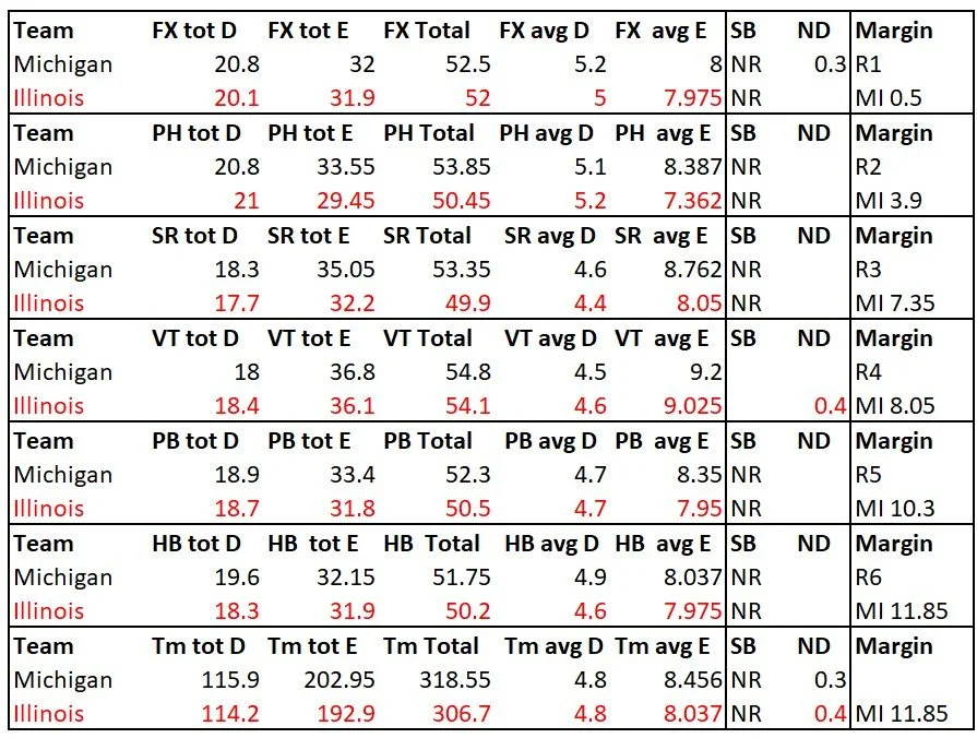 Michigan defeated Illinois 318.55 to 306.7. Illinois had the difficulty to challenge Michigan (114.2 to Michigan’s 115.9), but had struggles on pommel horse and still rings, and was not able to make it up anywhere else.
