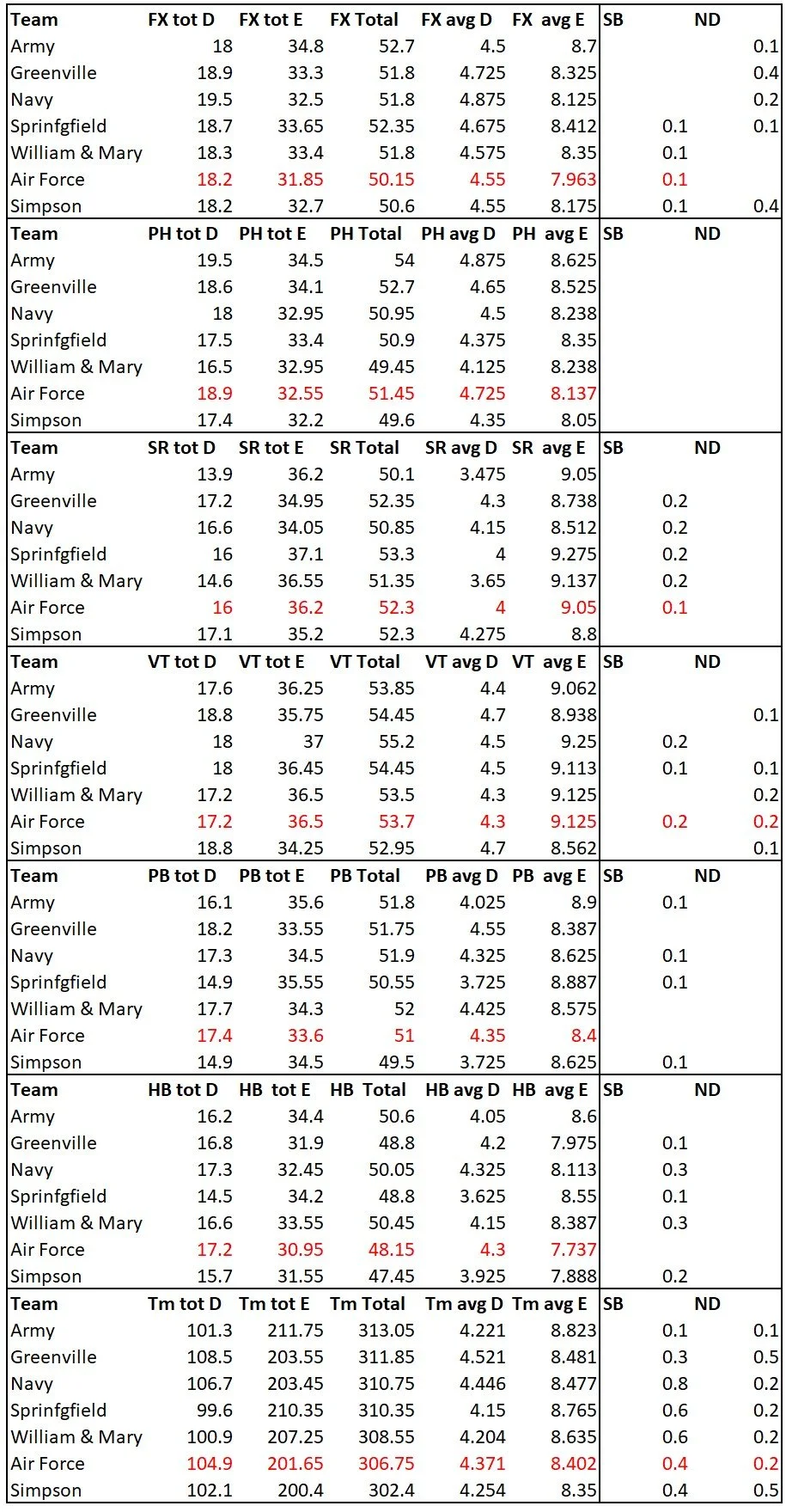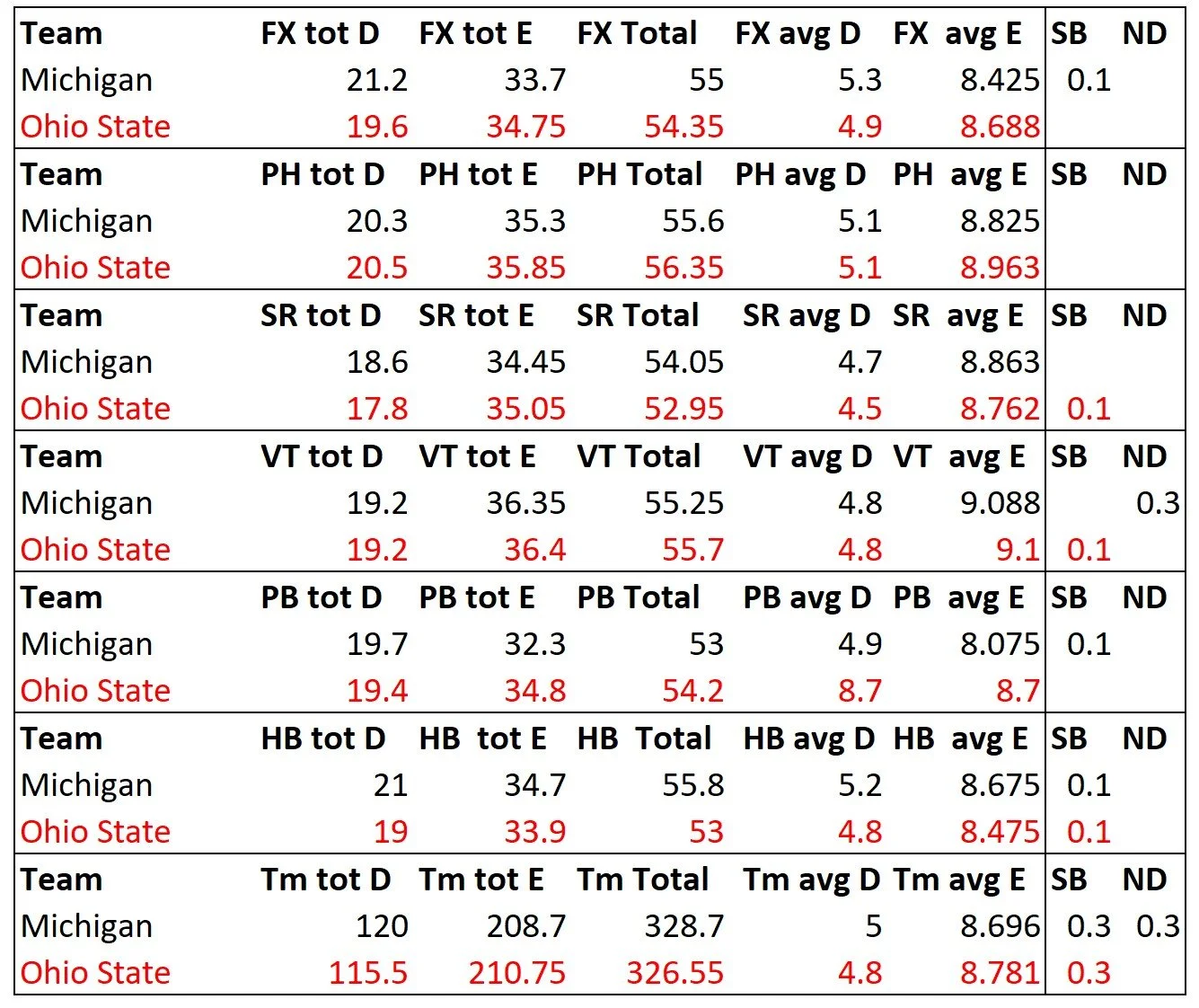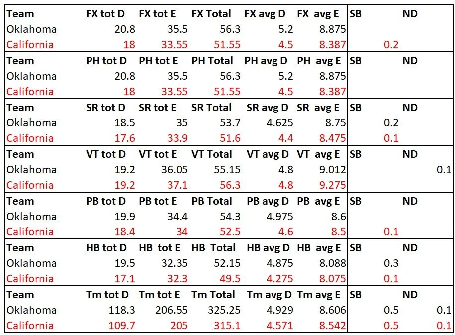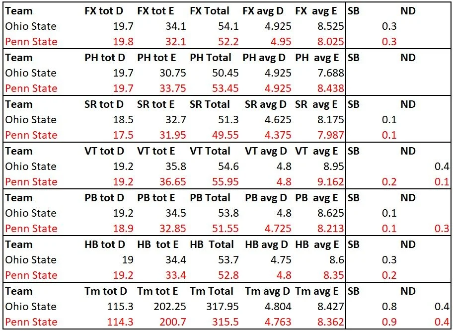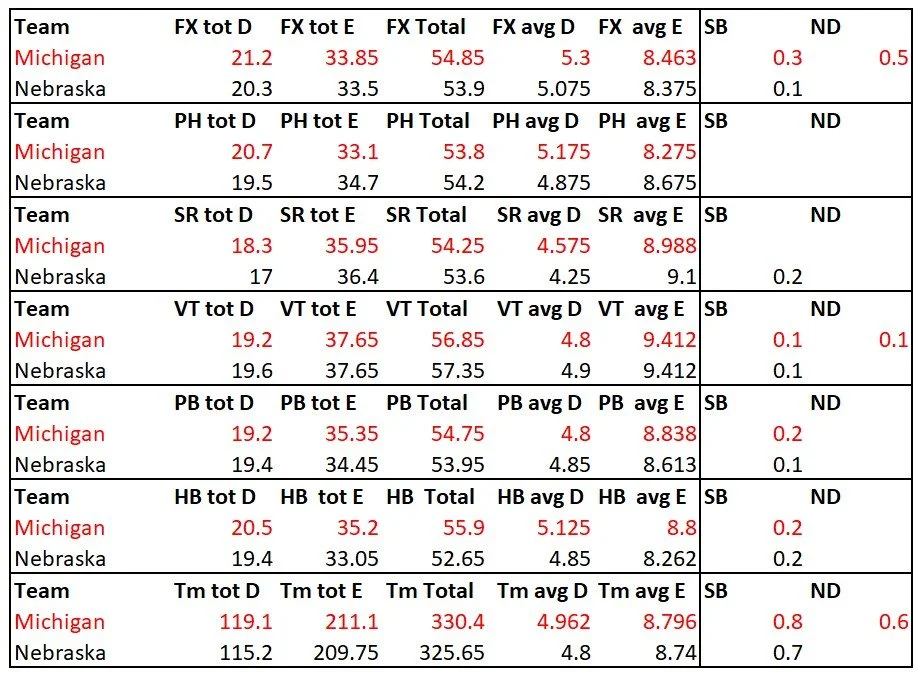 Army is up there with the big boys. They got the highest road total E score of the season. I’m not good enough with the FIG code to have ever figured this out on my own. This gives teams that can’t pile on the difficulty a way to shine, which most people would never see without this information.