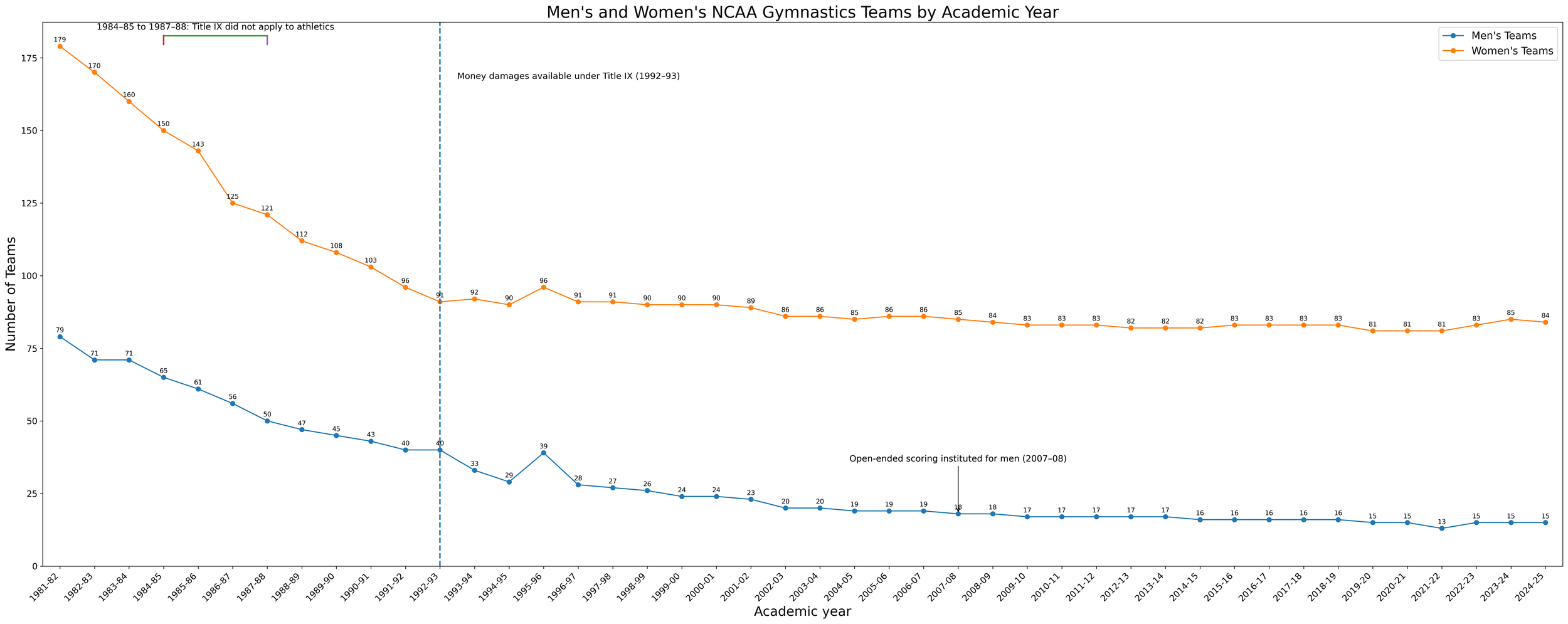 The numbers in the scoring do not appear to have any relationship to troubles of men’s NCAA gymnastics. The women also went through a period of decline, but are better off now because of a combination of Title lX protections, starting with a larger initial population, and greater cultural acceptance of women doing gymnastics.