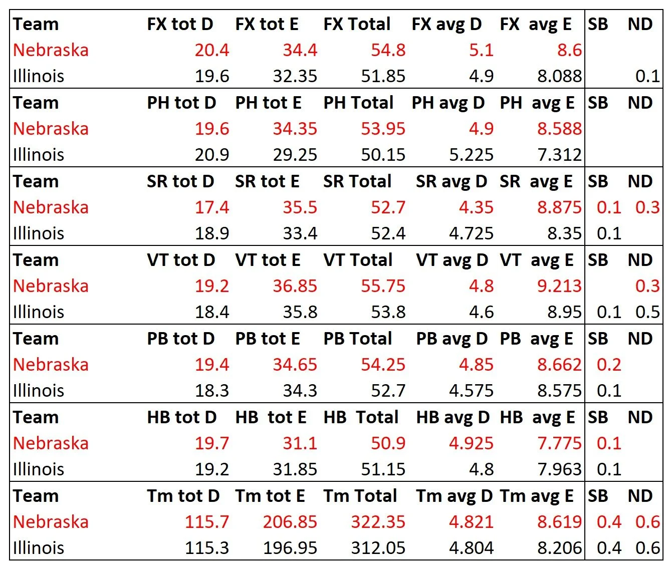 The Inside Gym post mentioned that there is no emotion associated with a number like 14.4. To me, that number is information. I can see Oklahoma having a PH rotation with all 14s or above (same with Nebraska and vault), and I know these are great scores. Some numbers are bigger than others. The information from the scores also tells me vault rotations score higher than other events mainly because of the E scores.