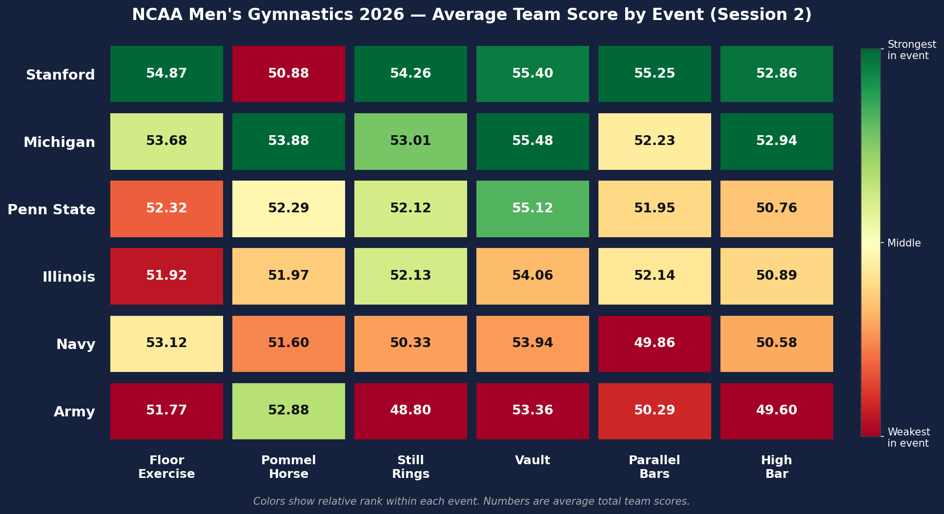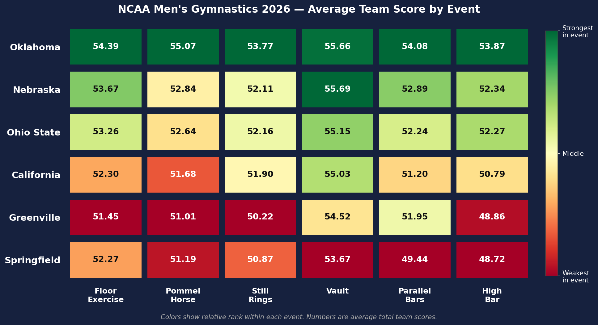 The heat map also highlights what has been a trouble spot for Stanford all season, because of consistency. Their difficulty is competitive with Oklahoma on that event.
