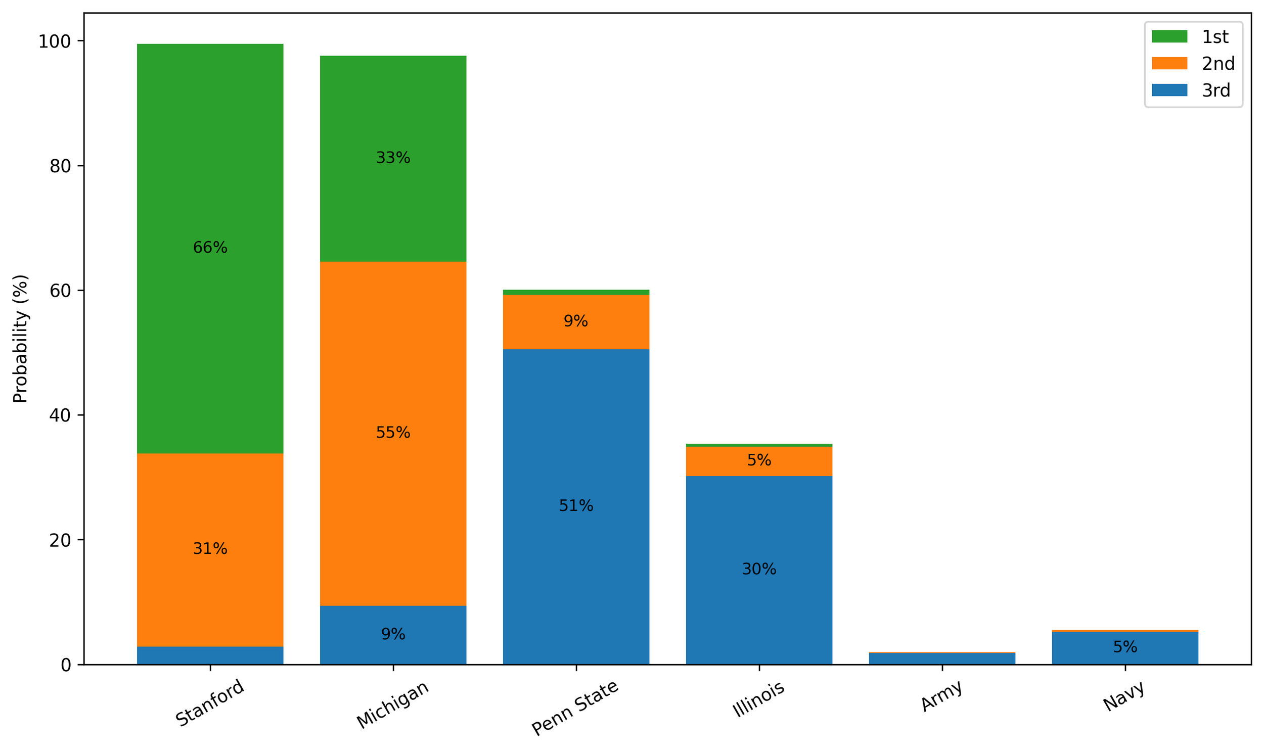 Stanford and Michigan are almost guaranteed to make it to the final. Where it gets interesting is the race between Penn State and Illinois. Illinois has the difficulty, they just haven’t been able to put it all together because of injuries and bad luck. The computer has Penn State ahead, but the last time these two met, Illinois finished ahead. Illinois may have been conserving in anticipation of being at home for the championships. I would put these two closer together than the model does.